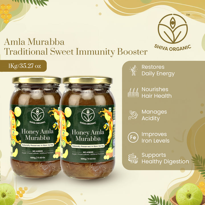 Shiva organic brings the goodness of amla, India’s age-old superfruit, infused with the golden sweetness of pure honey. This unique blend brings together two of nature’s most powerful healers, creating a delicious remedy packed with antioxidants, vitamins, and natural immunity boosters. It contains almost all benefits of Amla – Natural aphrodisiac, anti ageing, nervine tonic. It Rejuvenates the digestive system. It is a rich source of anti oxidants, improves immunity ;Balya(tonic). Amla soaked in honey not only enhances digestion and strengthens the immune system but also supports glowing skin, healthy hair, and overall vitality. It’s a simple yet extraordinary idea – a sweet, tangy, and nourishing way to enjoy wellness every day.