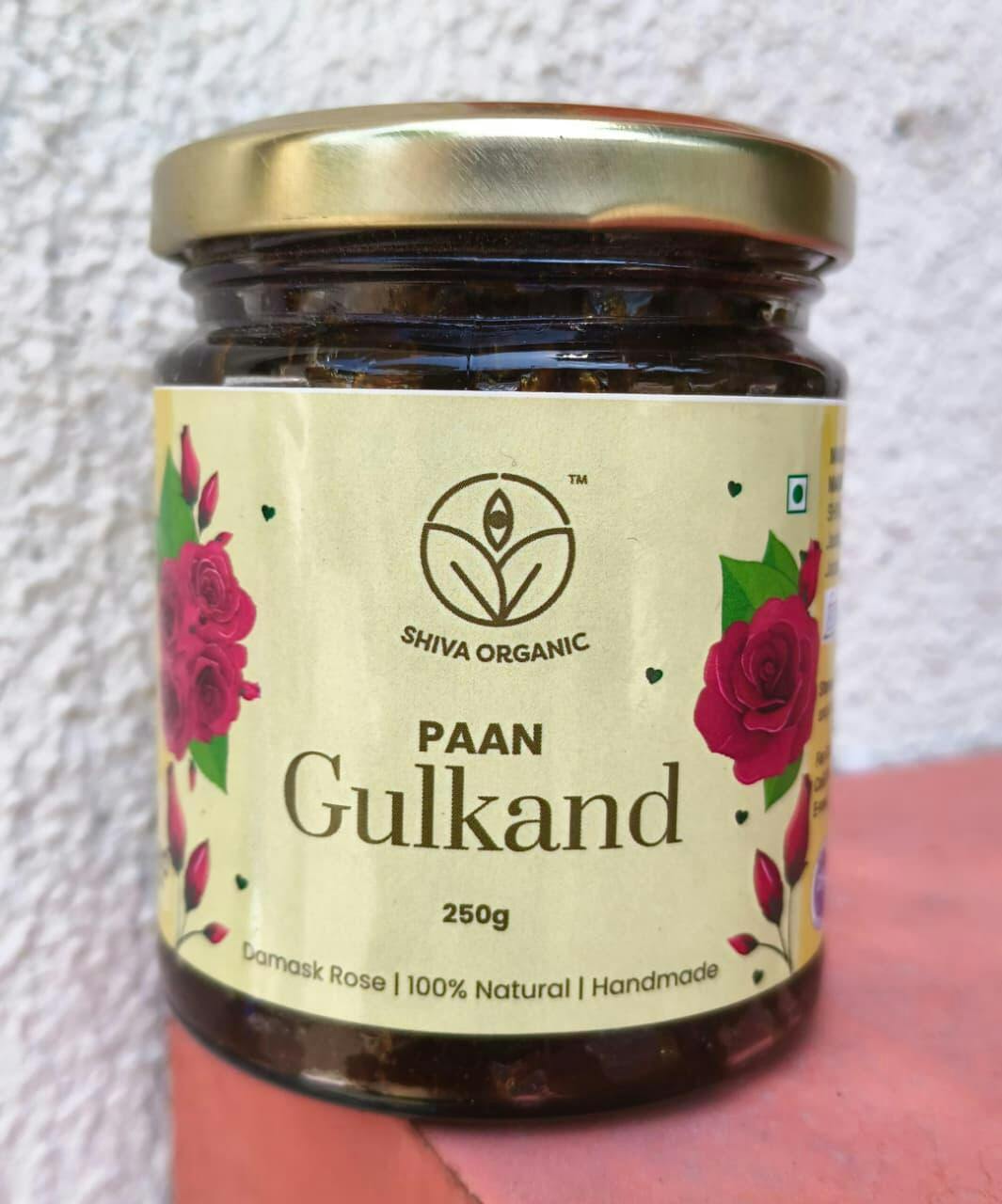 Paan Gulkand- Gulkand, often referred to as the "Rose Petal Jam," is more than just a sweet treat; it is a reflection of India's rich cultural heritage and the age-old practice of using natural ingredients for culinary and medicinal purposes. Shiva Organic’s Gulkand is prepared using ancient Ayurveda method, sun-cooked Rose Petals over a period of month, infused with herbs. Pan Gulkand is made by using desi gulab petals, desi mishri, fennel seeds, and  betel leaves. It can be enjoyed in a traditional paan, as a dessert, or as a refreshing drink, Gulkand continues to captivate the taste buds and offer a range of health benefits to those who savor its sweet essence.